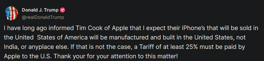 트럼프 대통령은 23일 ‘트루스소셜’에 게시한 글에서 “오래전 애플의 팀 쿡에게 미국에서 판매될 아이폰은 미국 내에서 제조돼야 한다고 알려왔다”며 “인도나 다른 어떤 나라가 아닌 미국에서 생산해야 된다고 알려줬다”고 작성했다.