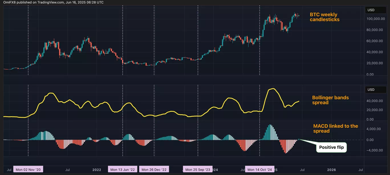 이번 분석에서는 볼린저 밴드의 간격(스프레드)을 기반으로 한 MACD 지표가 핵심이다. 이 지표는 과거에도 주요 상승장 직전에 양전환한 바 있다. 대표적으로 2020년 후반과 2024년 말 랠리 직전에 해당 신호가 나타났다.