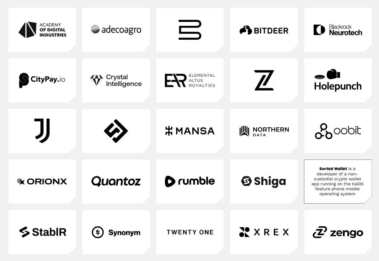 △ 아카데미 오브 디지털 인더스트리즈 △ 아데코아그로 △ 비트디어 △ 블랙록 뉴로테크 △ 시티페이 닷아이오 △ 크리스탈 인텔리전스 △ 엘리멘털 알투스 로열티스 △ 홀펀치 △ 유벤투스 △ 맨사 △ 노던데이터 △ 우빗 △ 오리온엑스 △ 콴토즈 △ 럼블 △소티드 월렛 △ 스테이블알 △ 시노님 △ 트웬티원 △ 엑스렉스 △ 젠고 등이 포함됐다.