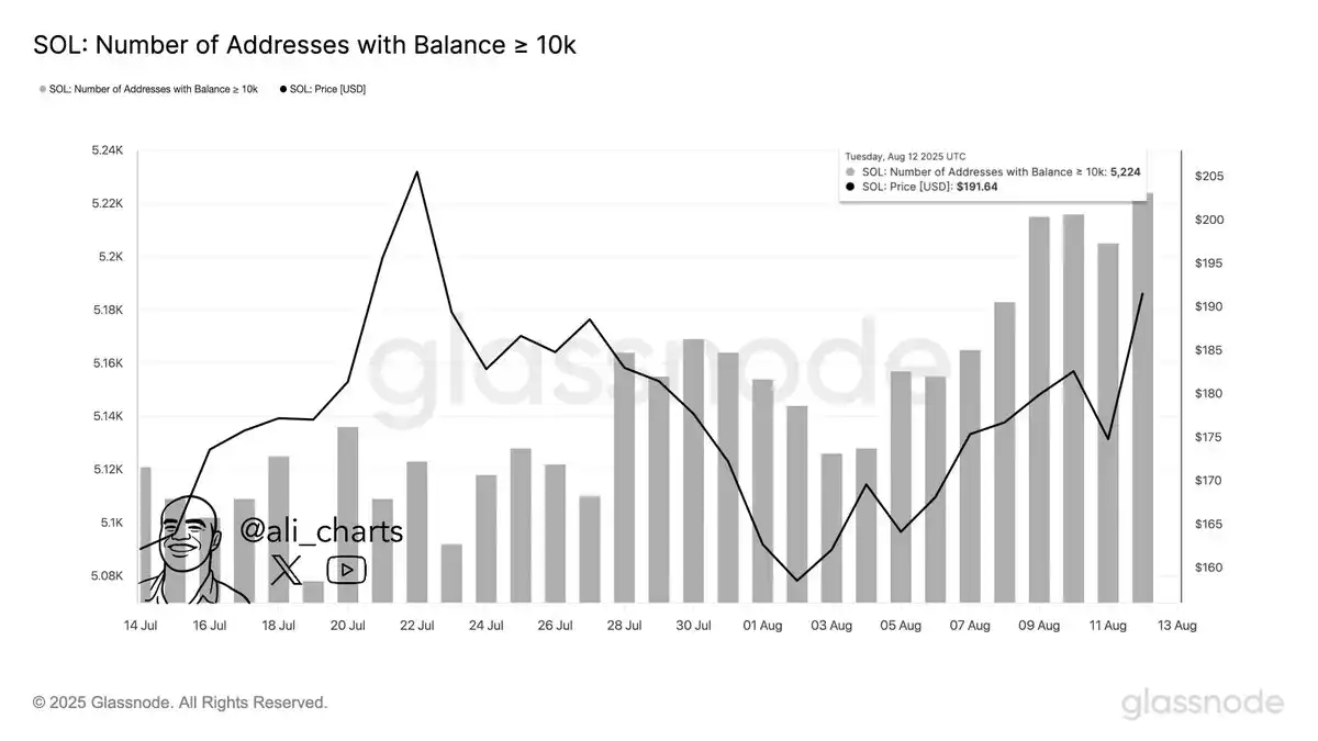가상자산 온체인 분석가 알리(@ali_charts)에 따르면, 15일 기준 솔라나(SOL)를 1만개 이상 보유한 지갑 수가 5,224개로 집계돼 사상 최고치를 기록했다.